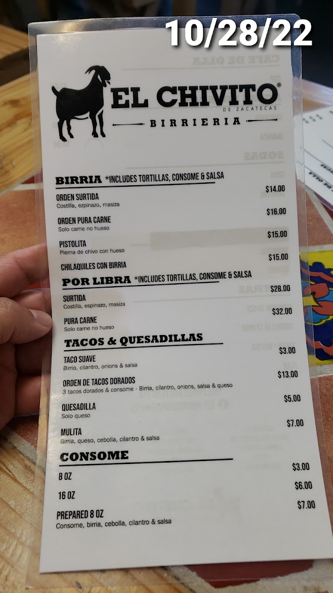 “ This is goat birria Nochistlan Zacatecas style. They sell it by the pound, plate, quesabirria, or taco. It is good. I really liked the QuesaBirria. The red salsa was really spicy just the way I like it. The cafe de hoya was good and the agua de pepino too. If you have never tried goat meat I recommend you try a taco first, and if you like it try a plate or quesabirria. ”